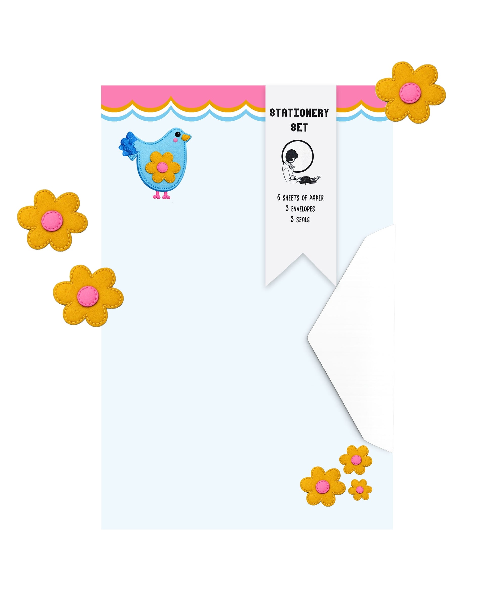 Includes six sheets of paper, three coordinating envelopes and three sticker seals.